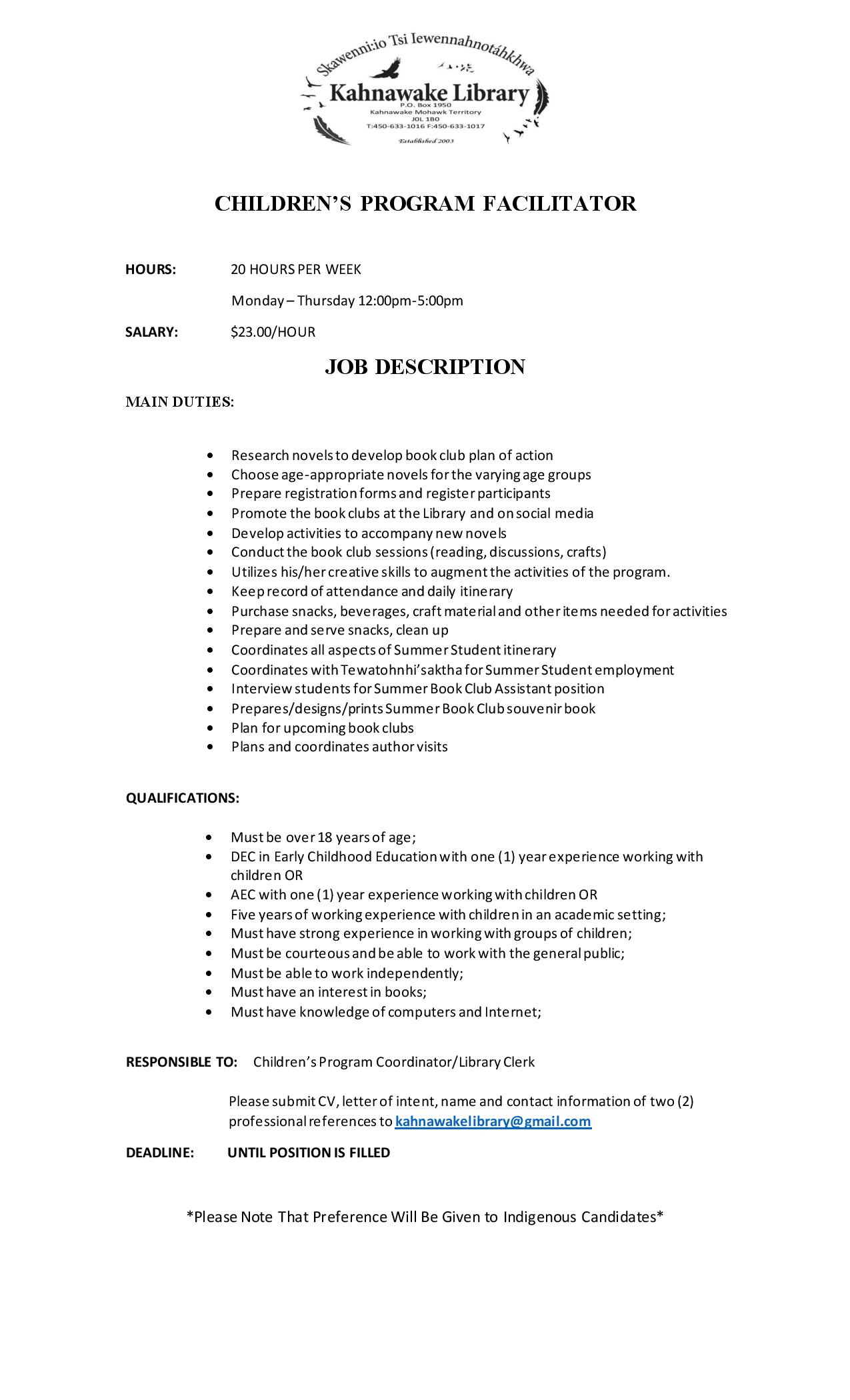 Deadline: Until Position Is Filled – Join the Kahnawake Library team as a Children’s Program Facilitator! This part-time role (20 hours/week) is perfect for someone passionate about working with children and promoting literacy through fun and engaging book club activities. You’ll be responsible for planning and leading age-appropriate book clubs, developing creative programming, organizing events, and supporting young readers in a vibrant community environment.